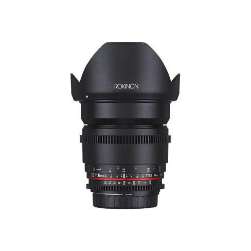 Buy rokinon 16mm t2 6 full frame cine ds lens canon ef mount featuring super wide angle 16mm lens full frame coverage multi layer coating reduces flare standard focus and iris gearing color matches cine ds lenses smooth clickless aperture ring dual sided focus and t stop marks hybrid aspherical lens elements manual focus and aperture built in petal type lens hood.